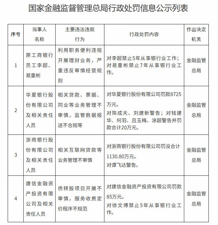 国有大行方面,原工商银行员工李超、易重彬因利用职务便利违规开展理财业务,严重违反审慎经营规则,国家金融监管总局对李超禁止5年从事银行业工作;对易重彬禁止7年从事银行业工作。